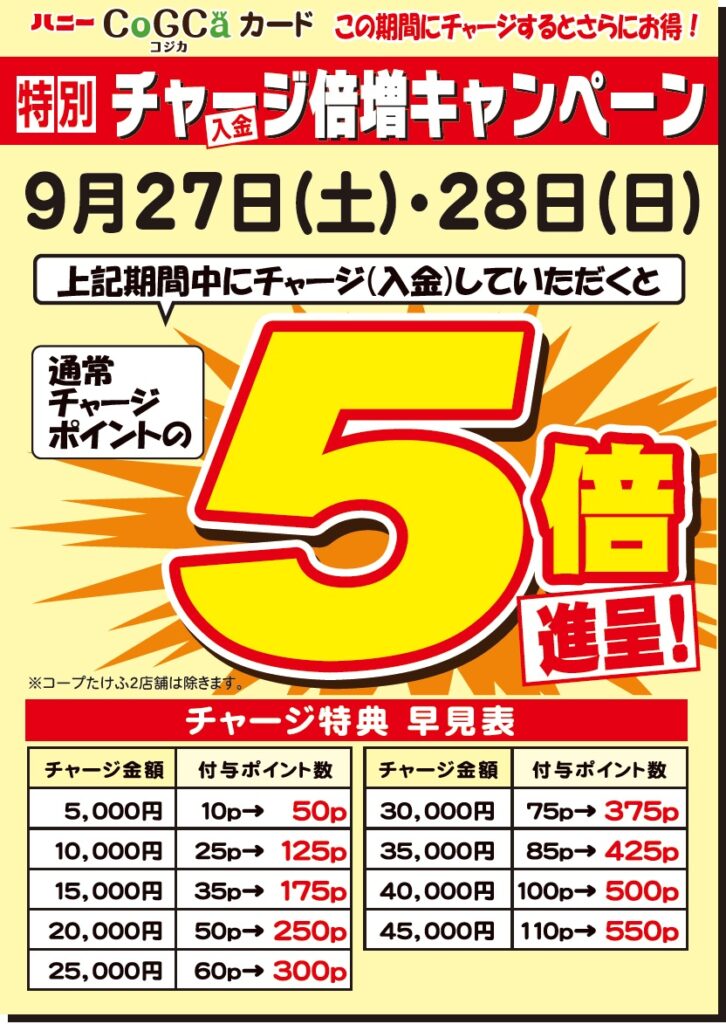 9月27日・28日〈特別コジカチャージ倍増キャンペーン5倍〉進呈