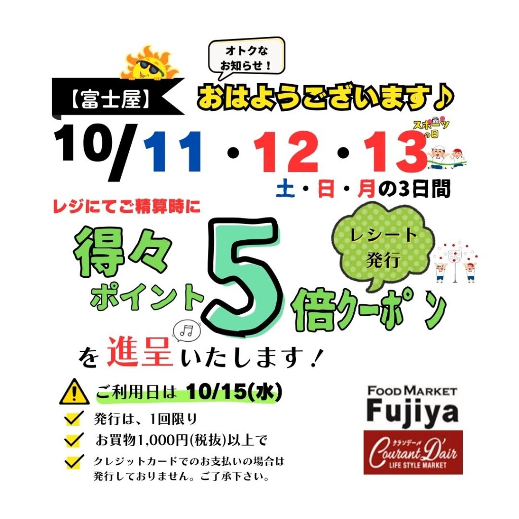 10月11日・12日・13日〈得々ポイント5倍クーポン〉進呈
