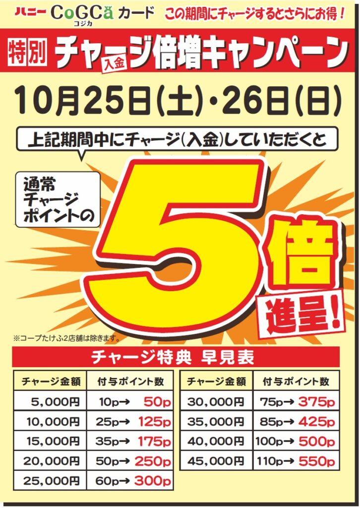 10月25日・26日〈特別コジカチャージ倍増キャンペーン5倍〉進呈