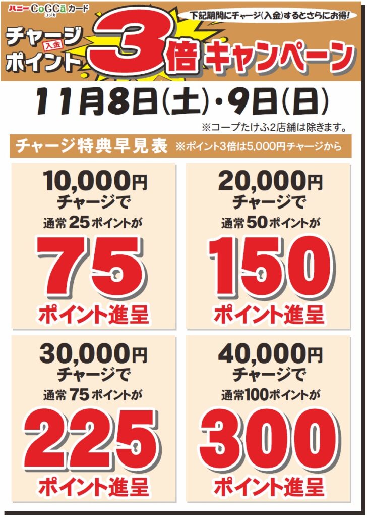 11月8日・9日〈コジカチャージキャンペーンポイント3倍〉進呈