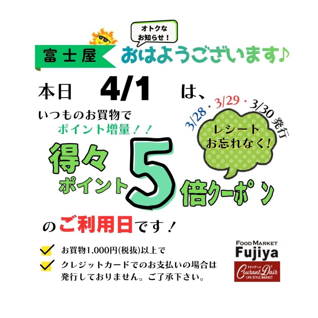 4月1日〈得々ポイント5倍クーポン〉ご利用日